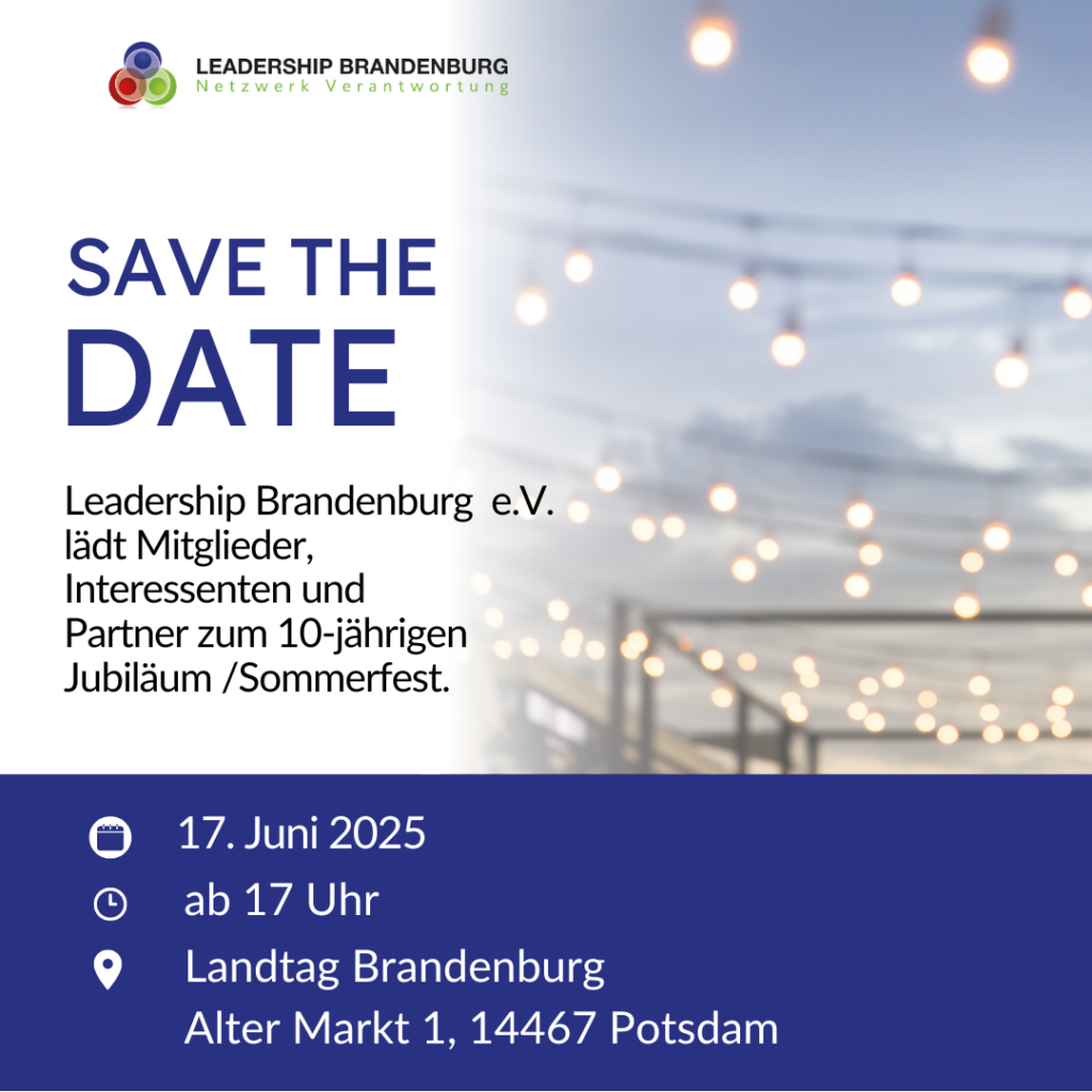 Bitte merkt euch für unser 10-jähriges Jubiläum Mittwoch, den 17. Juni 2026 vor! Wir freuen uns außerordentlich, dass wir diesen besonderen Meilenstein gemeinsam mit euch auf der Dachterrasse des Landtags in Potsdam feiern dürfen. Eine gesonderte Einladung mit allen Details folgt in Kürze.